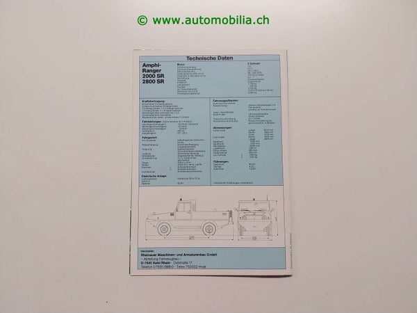 Sichern Sie sich das originale RMA Amphi-Ranger Prospekt, ein wertvolles Sammlerstück für Oldtimer-Enthusiasten, Liebhaber ungewöhnlicher Fahrzeuge und Automobil-Sammler. Dieses Prospekt präsentiert die Modelle 2000 SR und 2800 SR des RMA Amphi-Ranger, einem einzigartigen Amphibienfahrzeug, das sowohl auf Land als auch auf Wasser bewegt werden kann.