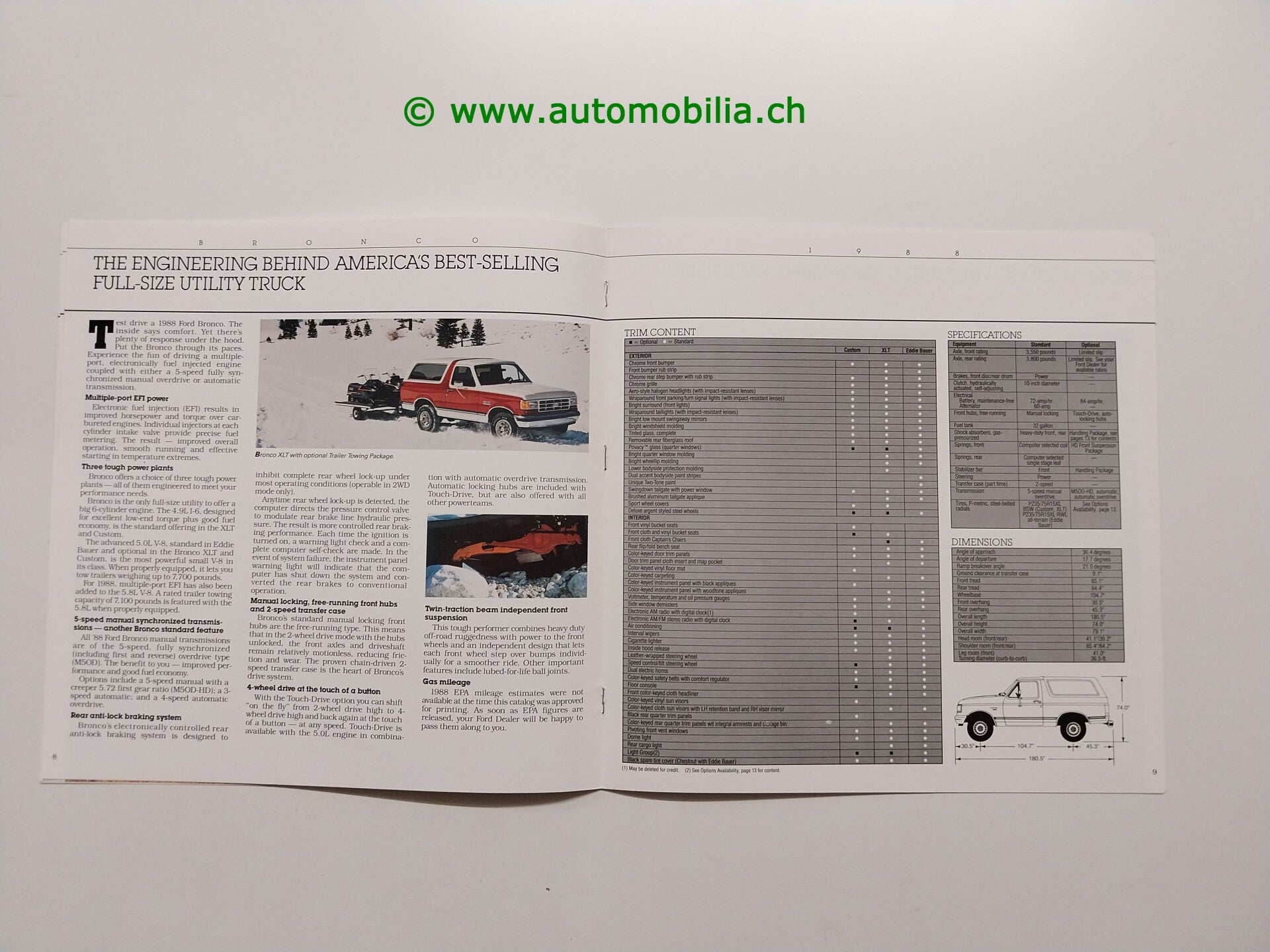 Sichern Sie sich das originale Ford Bronco Prospekt, ein wertvolles Sammlerstück für Ford-Enthusiasten, Liebhaber klassischer amerikanischer SUVs und Automobil-Sammler. Dieses Prospekt präsentiert den Ford Bronco 1988, ein kultiges amerikanisches Geländefahrzeug der späten 1980er Jahre, und bietet umfassende Informationen zu Design, Technik und Ausstattung.