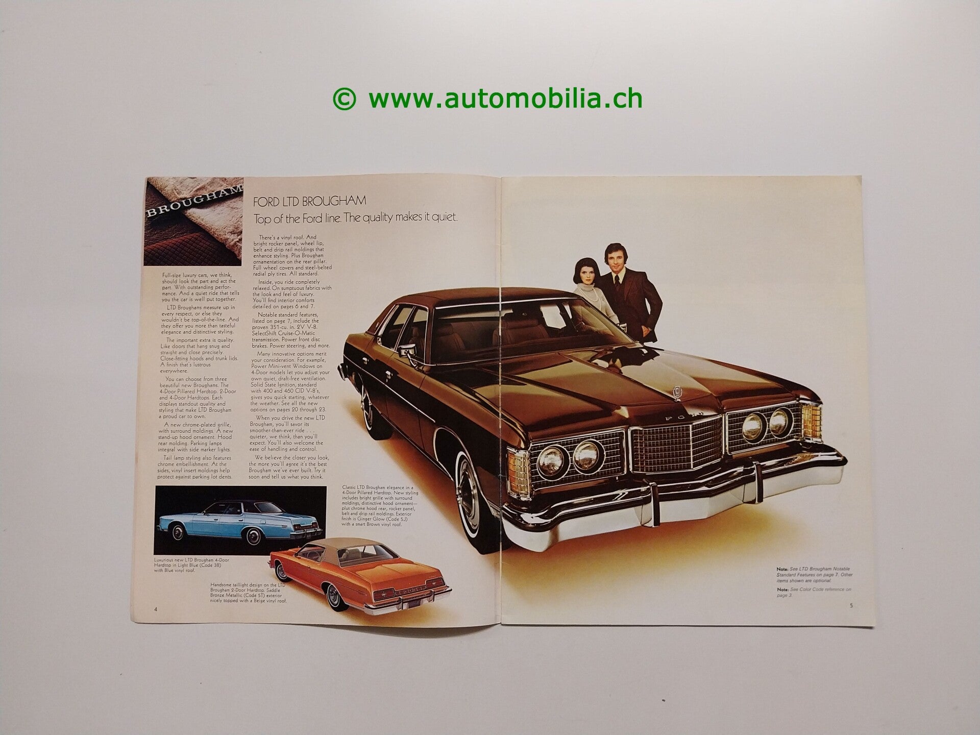 Dieses Prospekt stellt das Ford Modellprogramm 1974 mit den Modellen LTD Brougham, LTD, Galaxie 500, Custom 500 und Station Wagons vor, inklusive Ausstattungsoptionen, technischen Daten und Design-Highlights.
