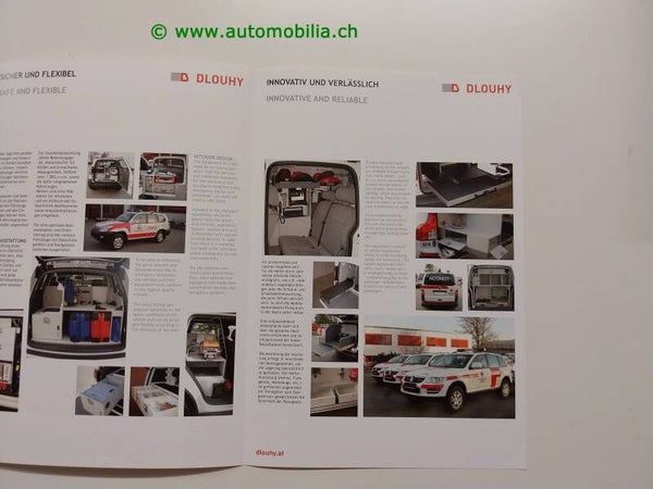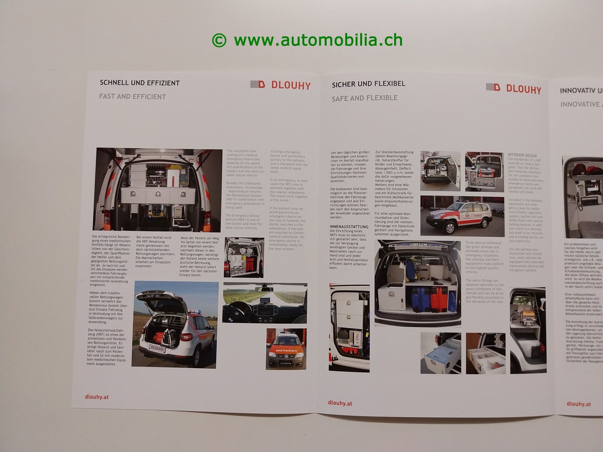 Das Prospekt behandelt die Modelle: Audi A6, BMW X3, Land Rover Freelander, Nissan Pathfinder, Skoda Octavia, Toyota Land Cruiser, Volvo XC90, VW Caddy, VW Passat, VW Sharan, VW Tiguan, VW Touareg, VW Transporter T5. Es bietet einen detaillierten Einblick in Ambulanz- und Notruffahrzeuge, deren Ausstattung, Anpassungen und Einsatzmöglichkeiten.