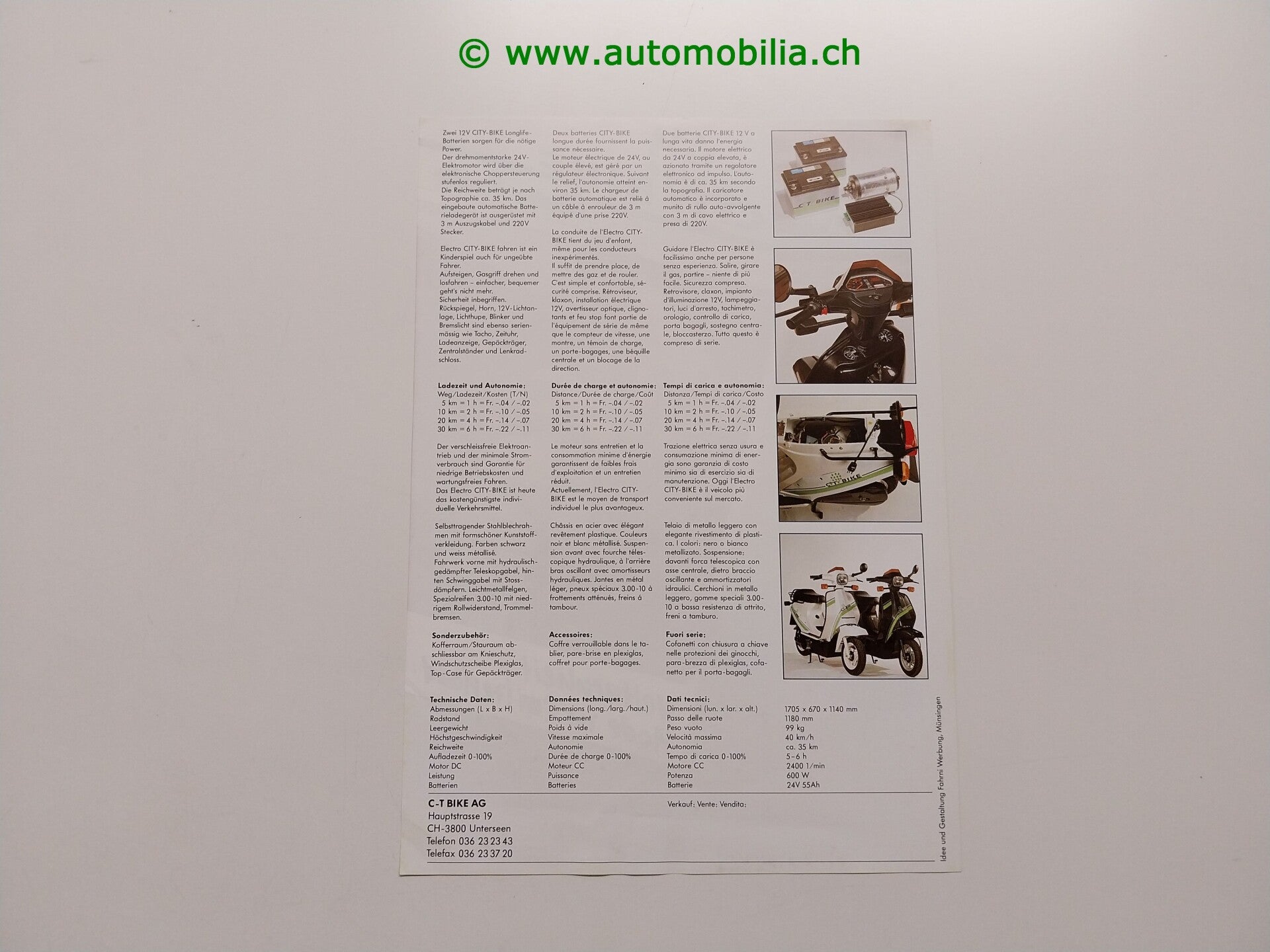Das Prospekt ist mehrsprachig (Deutsch, Französisch, Italienisch) verfasst, stammt aus der Schweiz und umfasst 2 Seiten im Format ca. 21 x 29,5 cm. Der Zustand ist gut erhalten, mit leichten Gebrauchsspuren. Herausgeber ist die Schweizer Herstellerfirma C-T Bike.