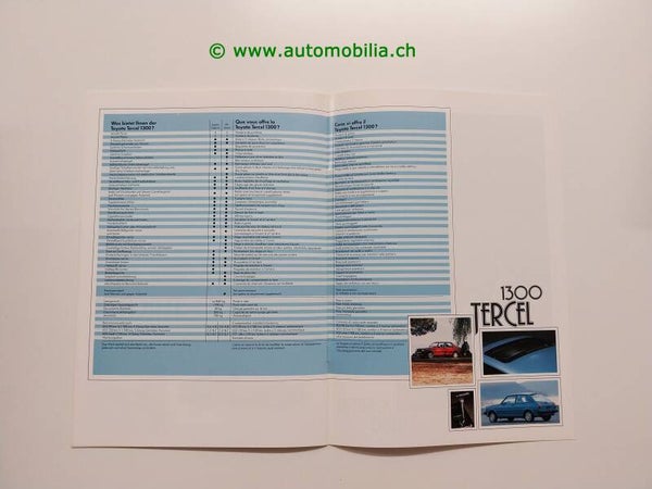 Zum Verkauf steht ein originales Prospekt des Toyota Tercel 1300. Dieses hochwertige Dokument wurde in der Schweiz gedruckt und bietet umfassende Informationen zu Design, Technik und Ausstattung des kompakten Tercel 1300 Modells.