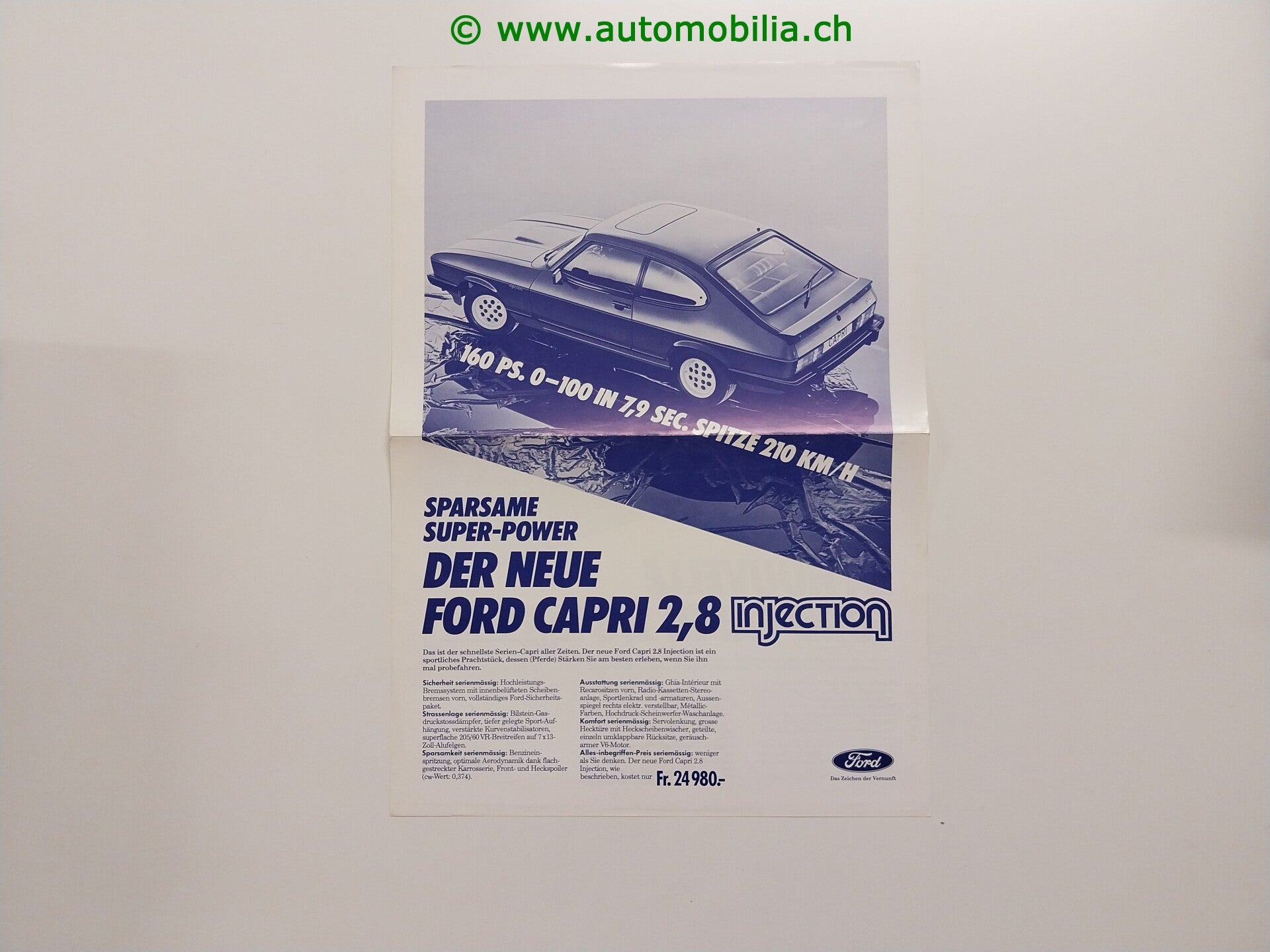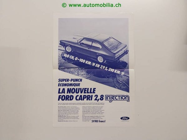 Erleben Sie die Faszination des legendären Ford Capri 2.8 Injection mit diesem originalen Ford Werbeprospekt aus der Schweiz. Dieses großformatige, doppelseitige Prospekt im Format ca. 30 x 42 cm zeigt den ikonischen Sportwagen in seiner kraftvollsten Variante – den 2.8 Injection, der mit seiner Mischung aus Performance, Stil und britischer Ingenieurskunst zur Legende wurde.