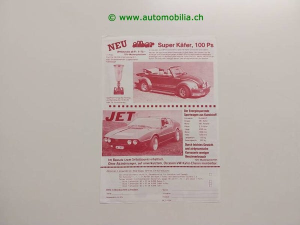 Zum Verkauf steht ein originaler Prospekt des Schweizer Herstellers Albar, der die Modelle Super-Käfer, Buggy, Sonic und Jet präsentiert. Das Prospekt umfasst 2 Seiten, ist in Deutsch verfasst und im klassischen A4-Format (ca. 21 × 29,5 cm) gedruckt.